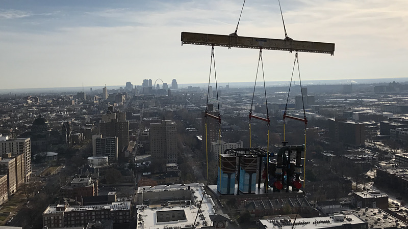 This 36-story Luxury Apartment complex was recently completed, allowing Jarrell Mechanical Contractors to install their in-house prefabricated mechanical skid consisting of boilers, pumps, and piping prior to the mechanical room being completely assembled. This allowed them to utilize the tower crane for installation of the system.
